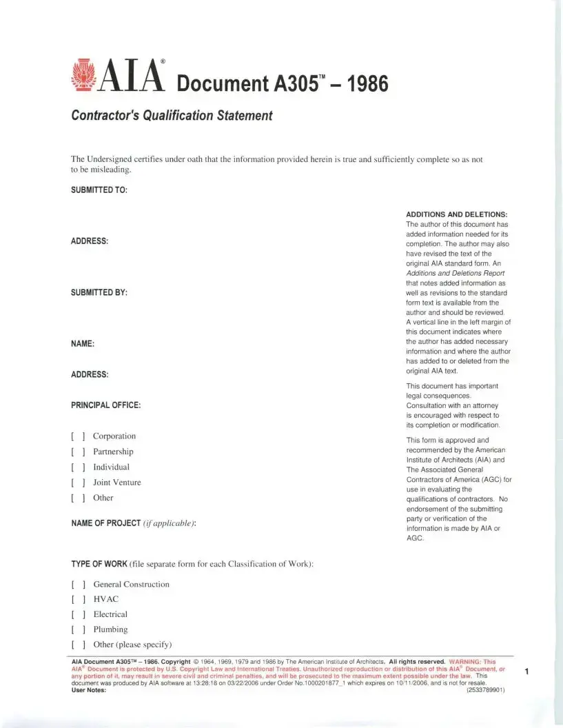 The AIA A305 form, also known as the Contractor’s Qualification Statement, plays a crucial role in the construction industry by serving as a key document that outlines a contractor's qualifications and experience. When seeking to win contracts, contractors often highlight their professional history, financial standing, and past project performance through this form. It aids owners and architects in assessing the capabilities of potential contractors, ensuring they choose a competent and reliable partner for upcoming projects. Key sections of the form include details about the contractor's organizational structure, experience with similar projects, financial statements, and references from previous clients. Moreover, it provides a snapshot of the contractor's safety record and their commitment to quality and sustainability. By using the A305, stakeholders can facilitate informed decisions, enabling projects to move forward smoothly and efficiently, with a reduced risk of issues arising from contractor selection.