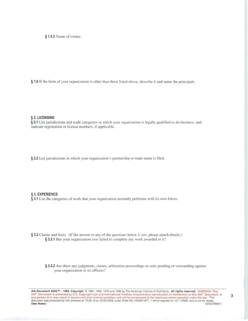 The AIA A305 includes sections that ask for a variety of information. This may consist of business structure details, financial information, project experience, safety records, and references from previous clients. The goal is to create a comprehensive picture of the contractor’s abilities and reliability.