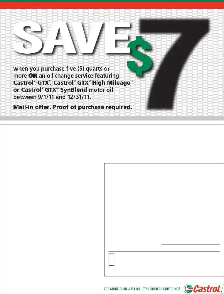 The Castrol Oil Promotion form is a mail-in certificate that allows customers to receive a $7 rebate when they purchase five quarts or more of specific Castrol motor oils or an oil change service featuring those products. This offer was valid from September 1, 2011, to December 31, 2011.