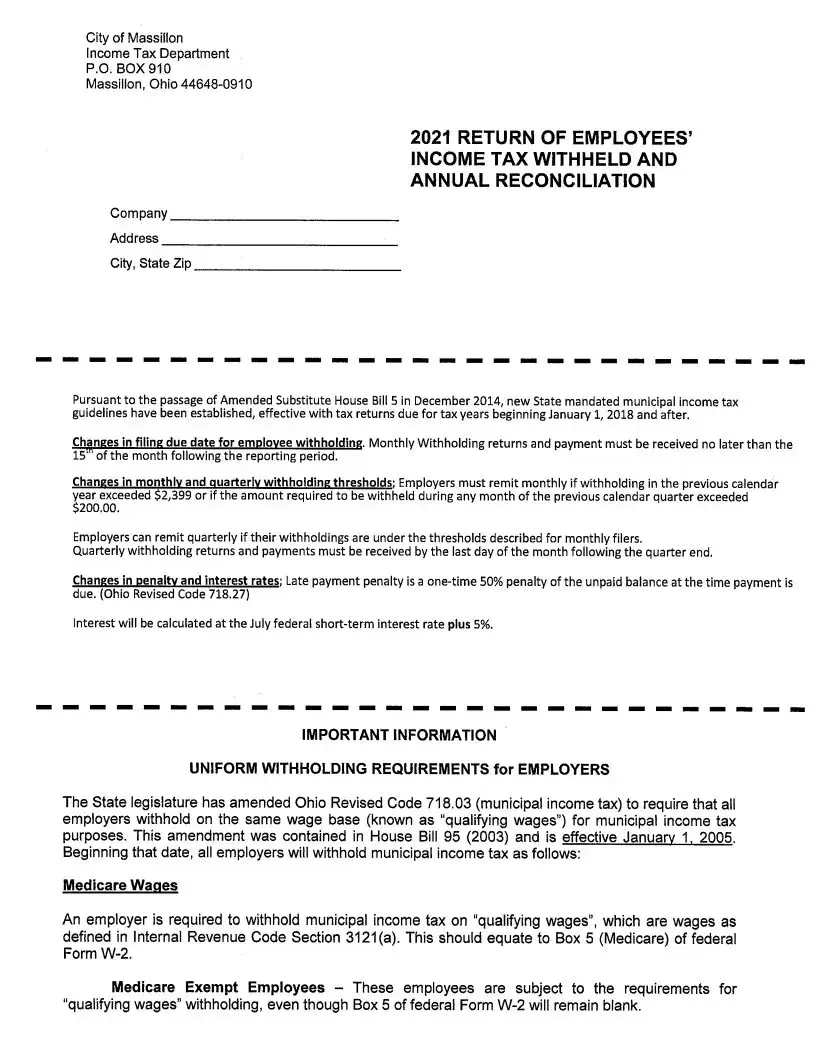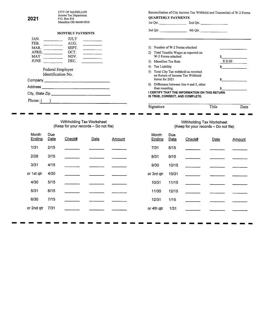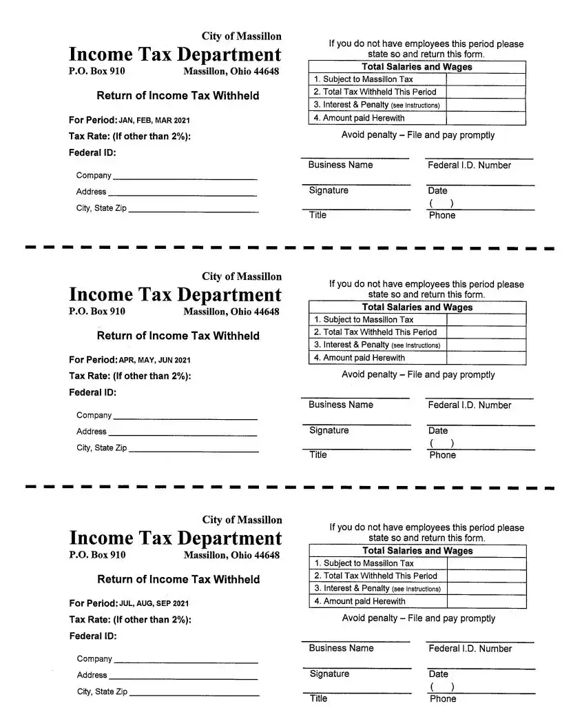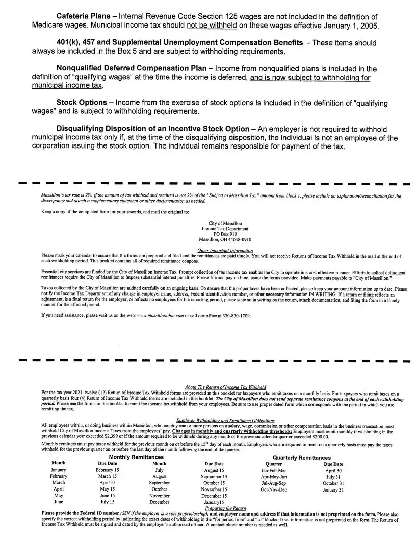 The tax rate for the City of Massillon is set at 2%. Employers must ensure that the amount withheld from employees’ wages reflects this rate. If there is a discrepancy, an explanation must be provided along with the submitted form.