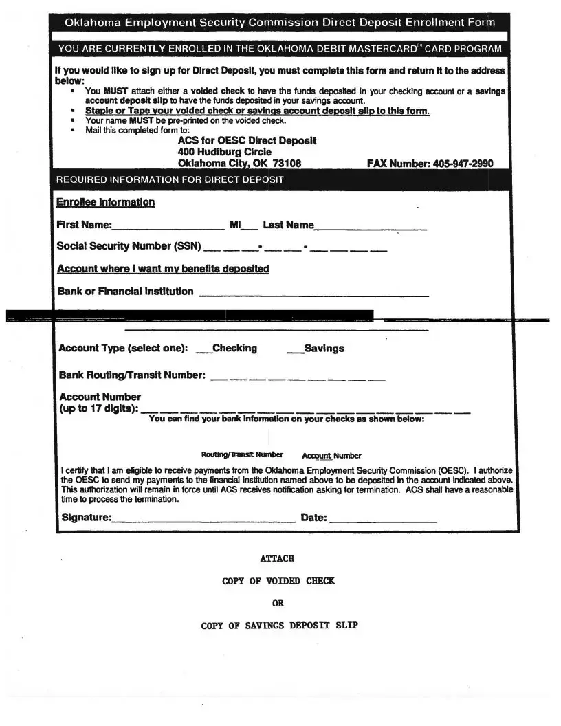 The completed form should be mailed to the following address: ACS for OESC Direct Deposit, 400 Hudiburg Circle, Oklahoma City, OK 73108. Make sure to send it promptly to avoid delays in receiving your benefits.