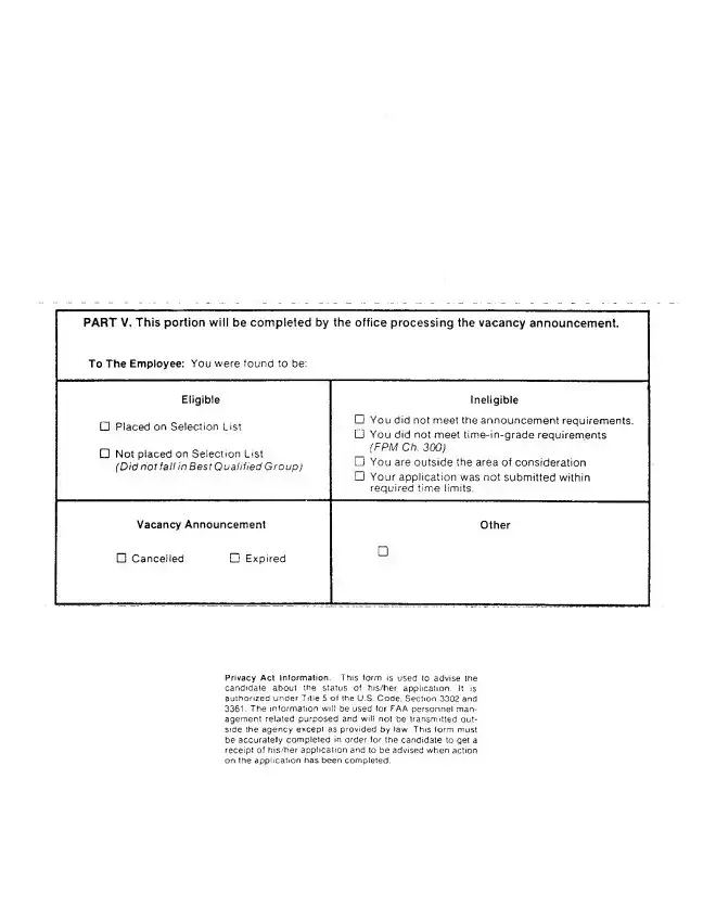 Part V of the form will be completed by the personnel office processing your application. This part informs you whether you were found eligible, placed on a selection list, or not placed due to various reasons. You will receive this information once action on your application has been completed.