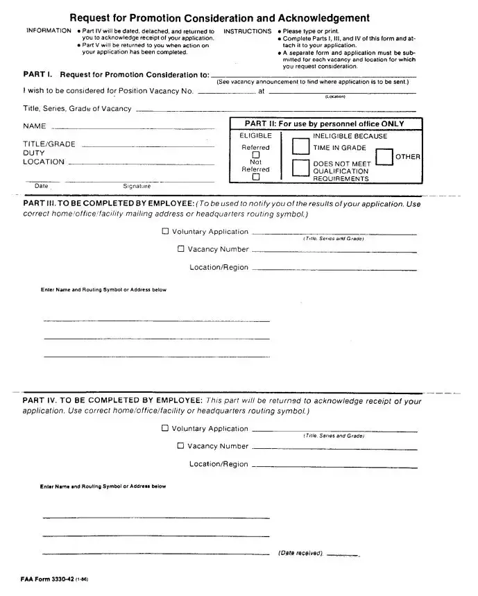 The FAA 3330 42 form is a Request for Promotion Consideration and Acknowledgement. It is designed for employees who wish to be considered for a specific position vacancy within the FAA. By completing this form, you formally express your interest in a promotion and ensure that your application is processed appropriately.