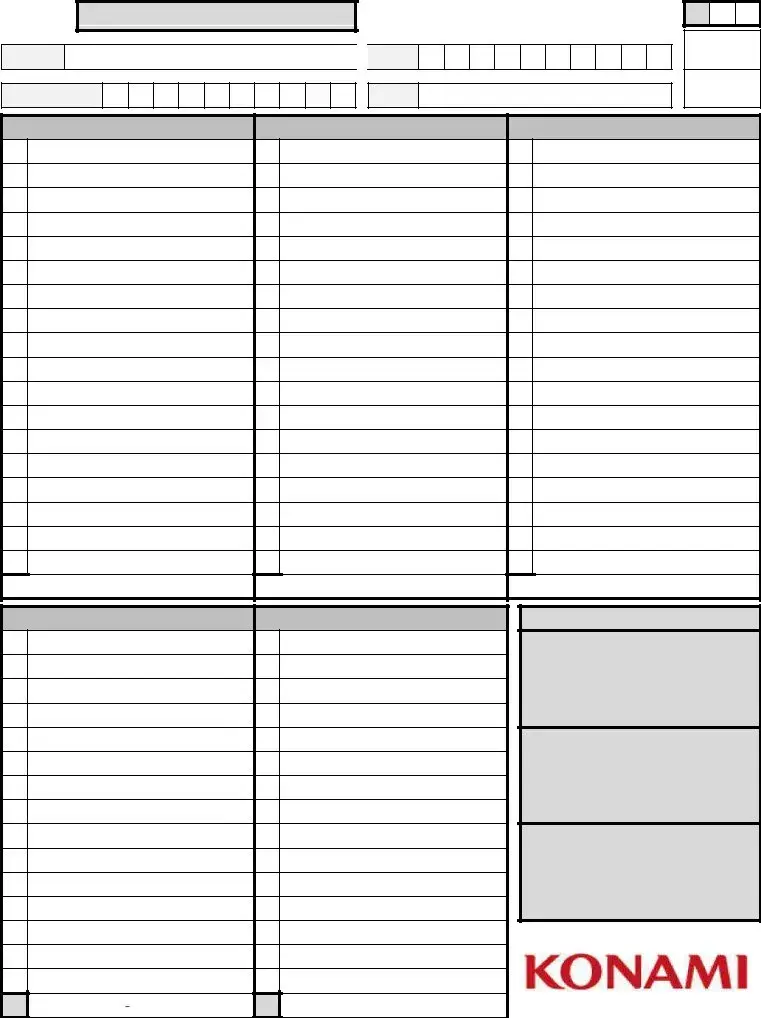 The Konami Decklist form shares similarities with the Standard Tournament Registration form used in various competitive events. Both require participants to fill out personal information, including full name and identification. Additionally, they ensure transparency by mandating the accurate listing of items or cards. Just as the Tournament Registration form focuses on event specifics and player identification, the Decklist form emphasizes the player's deck composition, detailing the quantities of various card types.