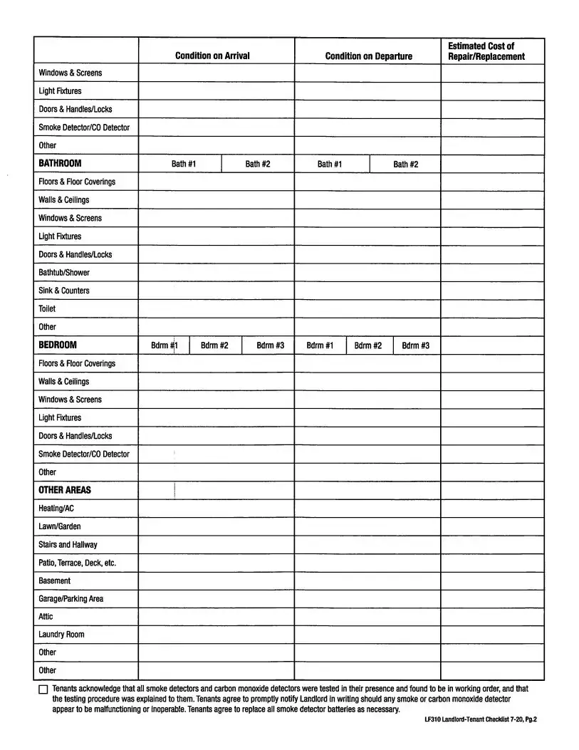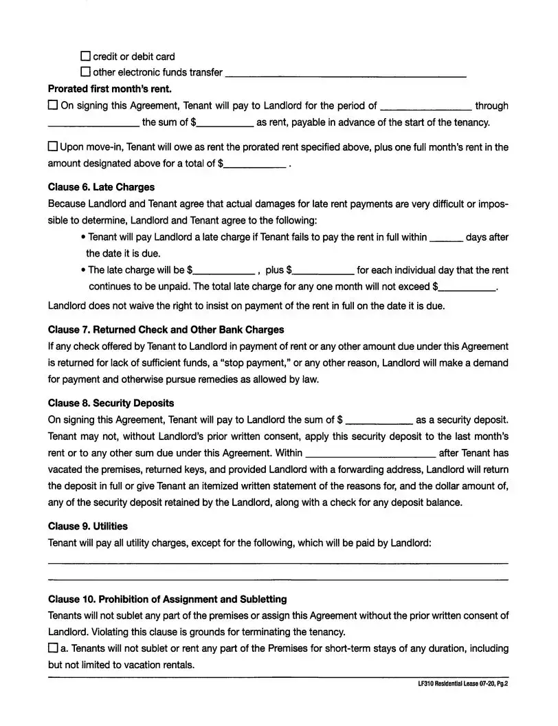 Upon signing the LF310 Residential Lease, tenants must pay a security deposit, which cannot be used as the last month's rent without the landlord's written consent. After the tenant vacates the property, the landlord is obligated to return the deposit within a specified timeframe, provided the tenant has returned the keys and given a forwarding address. If any part of the deposit is retained for damages or unpaid rent, the landlord must provide an itemized statement explaining these charges.