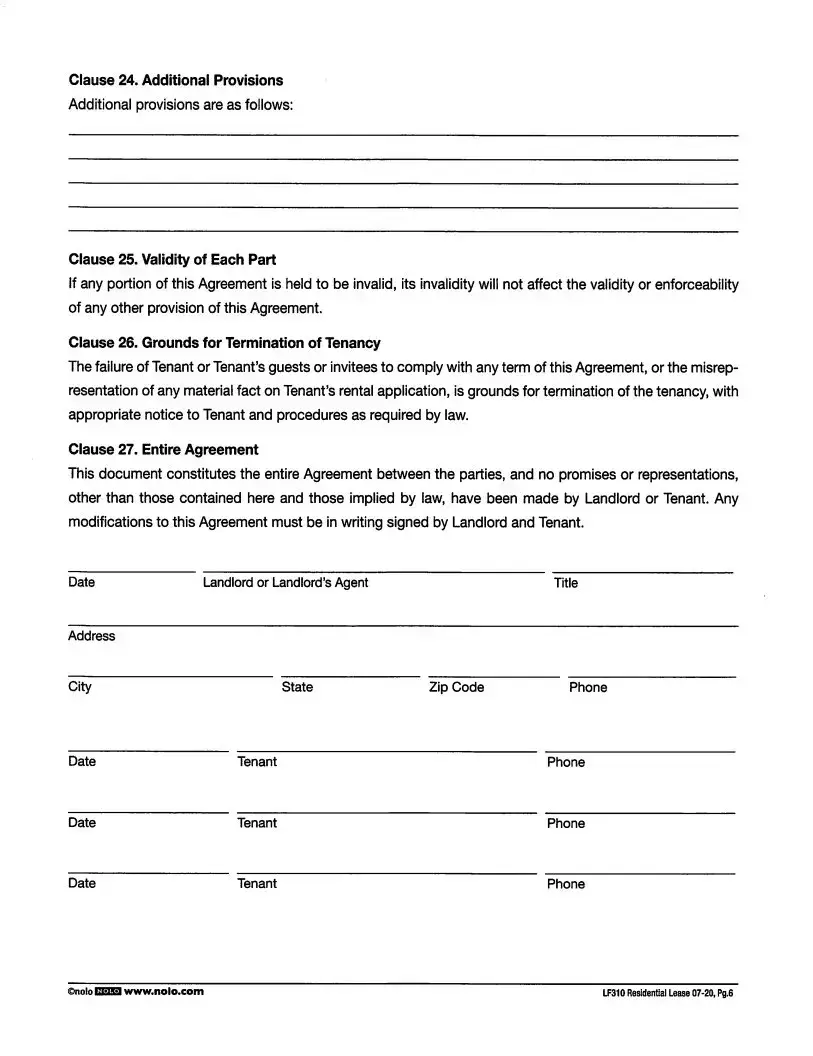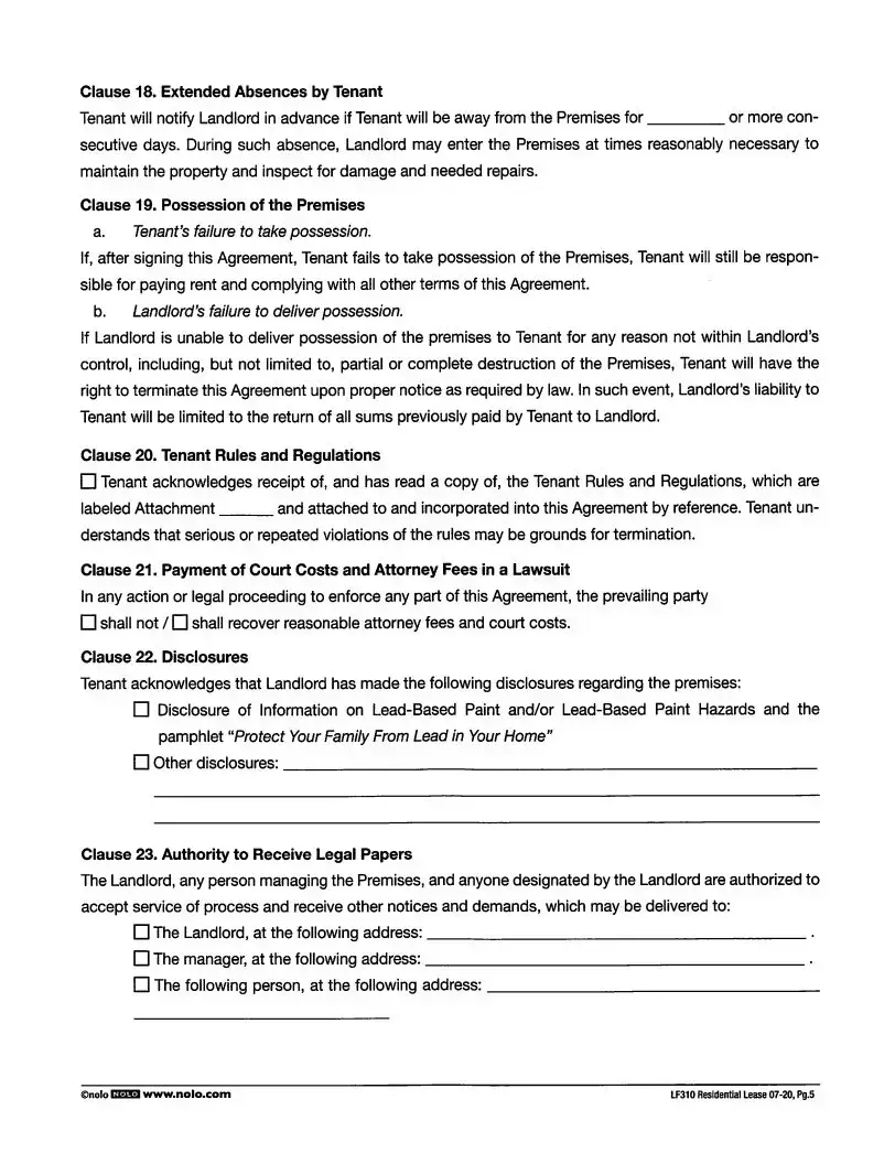 The LF310 Residential Lease form details the agreement between the landlord and tenant regarding the rental of residential premises. It identifies both parties, specifies the rental property, and outlines essential terms such as the rental amount, payment dates, security deposits, and responsibilities for utilities. It also addresses restrictions on use, occupancy limits, and conditions for subletting the premises.