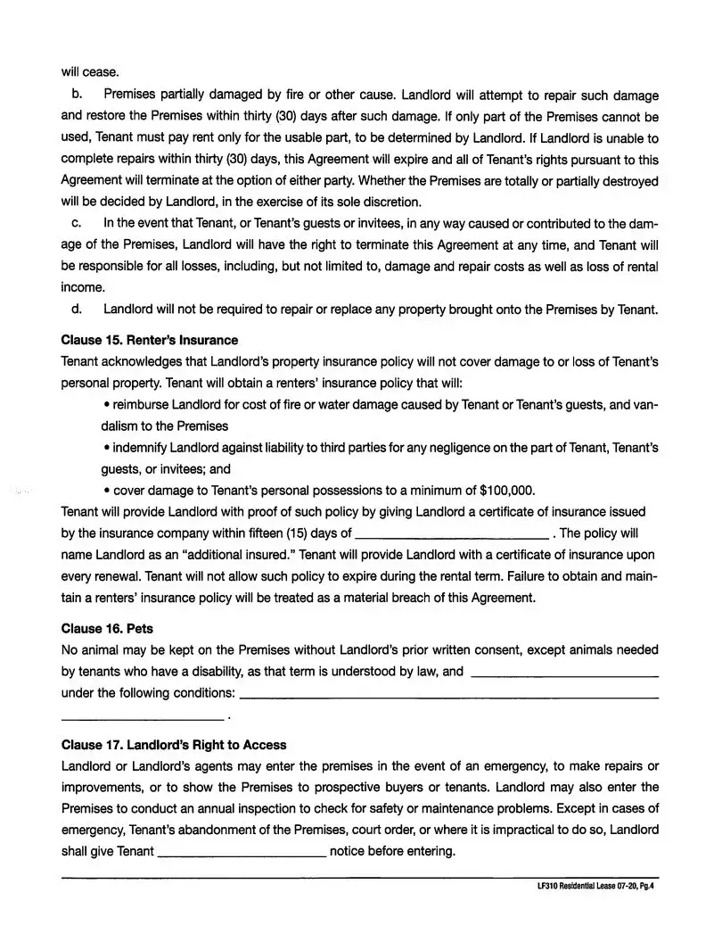 Under the LF310 form, tenants are required to pay a specified monthly rent amount on the first day of each month. If this day falls on a weekend or legal holiday, the payment is due on the following business day. The form allows for various methods of payment, such as cash, checks, or electronic transfers, ensuring flexibility for both parties. Additionally, if rent is not paid on time, late charges are outlined to incentivize timely payments.