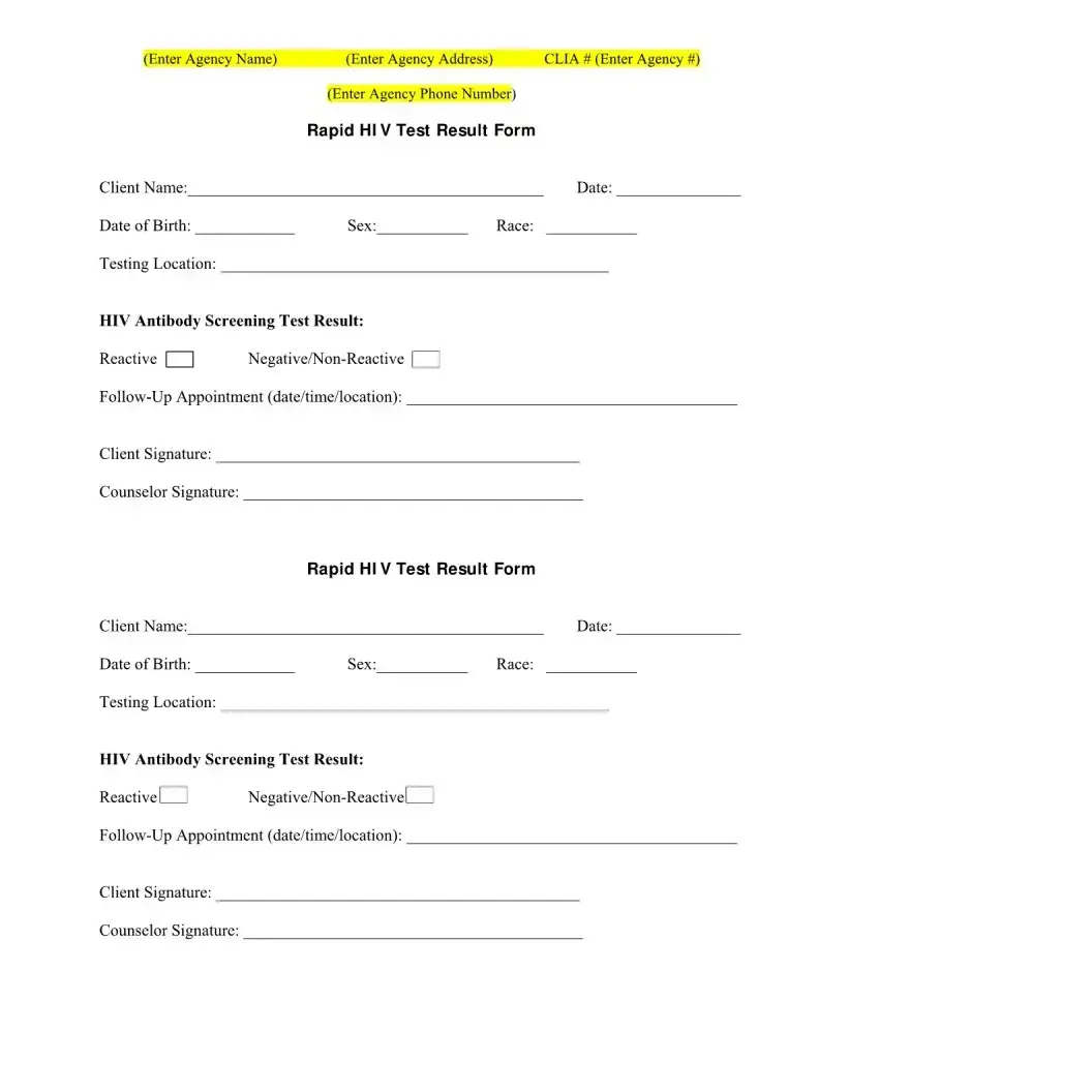 The form requires several key pieces of information, including the client's name, date of birth, race, testing location, and the result of the HIV antibody screening test. It also includes spaces for signatures from both the client and the counselor, as well as details about any follow-up appointments.